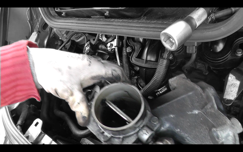 Die rechte Schraube von der Drosselklappengehäusehalterung lösen und rausziehen